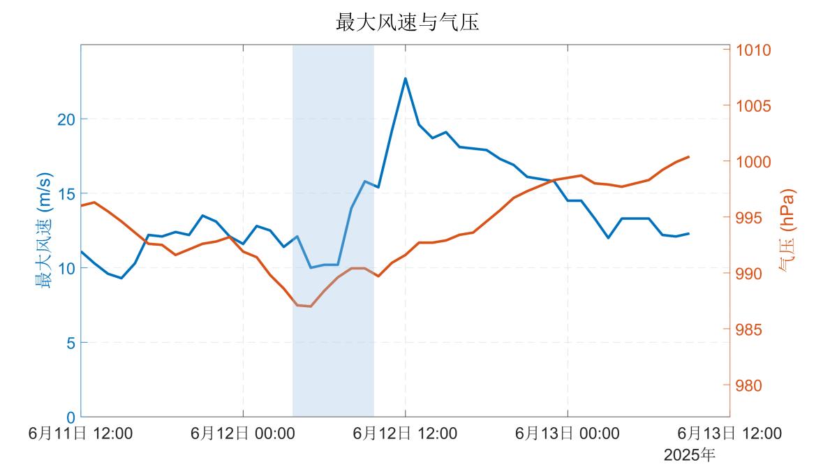 浮标此次捕获的数据能够有力支撑对台风的气象、水文、生态及上层海洋海流、温盐演变过程的分析。6月12日6时左右,“蝴蝶”台风中心抵达浮标所在海域,中心最低气压987hpa。过境后,风速急剧增大,浮标观测到最大风速22.7m/s,最大波高7.8m。浮标剖面观测数据显示,受台风影响,上层海洋混合加剧,水温下降,盐度降低,流速增强,混合层深度明显加深。